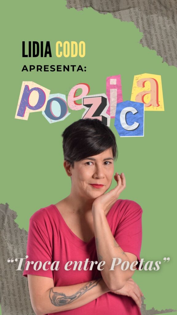 Poezica é um encontro entre poetas. Em vídeos publicados semanalmente, Lídia Codo propõe trocas poéticas com autoras e autores da cena contemporânea, trazendo ao público performances intimistas e intensas.